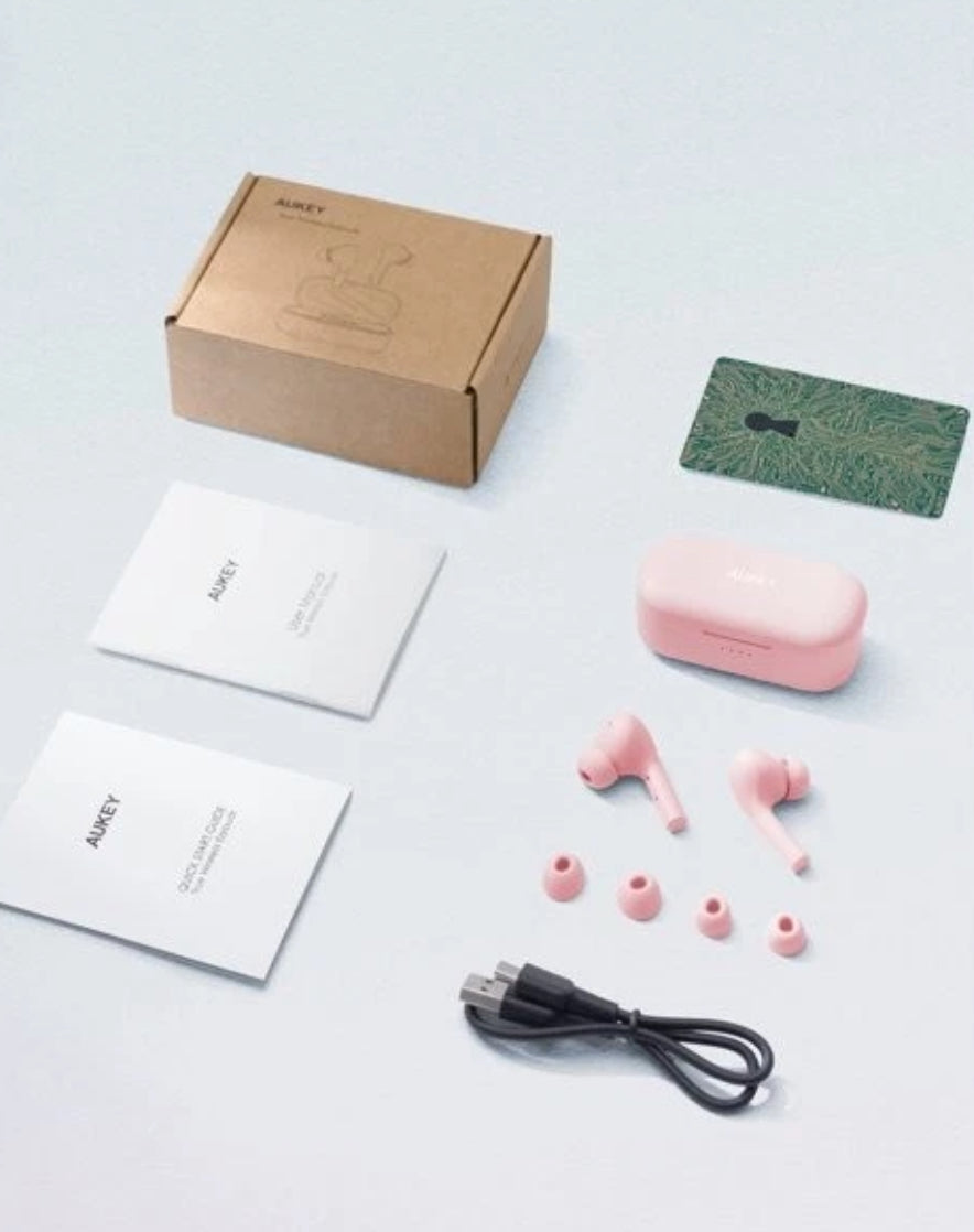 • Package Contents: AUKEY EP-T21S True Wireless Earbuds, Charging Case, Three Pairs of Ear-Tips (S/M/L), USB-C Cable, User Manual, Quick Start Guide.