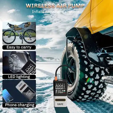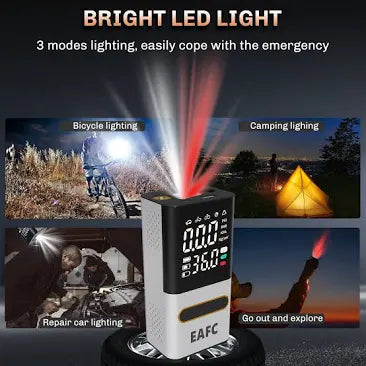 • Powerful & Cordless 150PSI Air Compressor for Multi-Vehicle Tires: Inflate car tires, motorcycle tires, bike tubes, and even sports gear (basketballs/soccer balls) effortlessly with **EAFC’s 150PSI cordless tire inflator**. Perfect for roadside emergencies, garage use, or camping trips—no outlet needed! The high-pressure motor delivers fast inflation (up to 35L/min) and handles SUV/truck tires (tested up to 33-inch wheels).